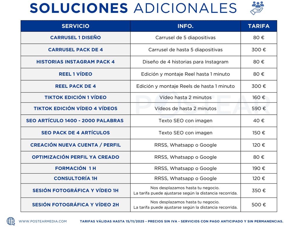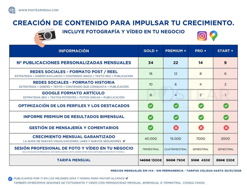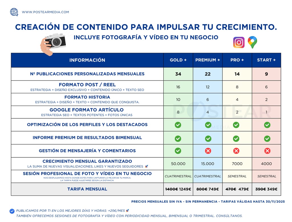 Tipo de contenido: Posts, artículos, reels, carruseles, fotografía profesional, vídeo, catálogos de productos, contenido SEO, y más, todo hecho a medida.