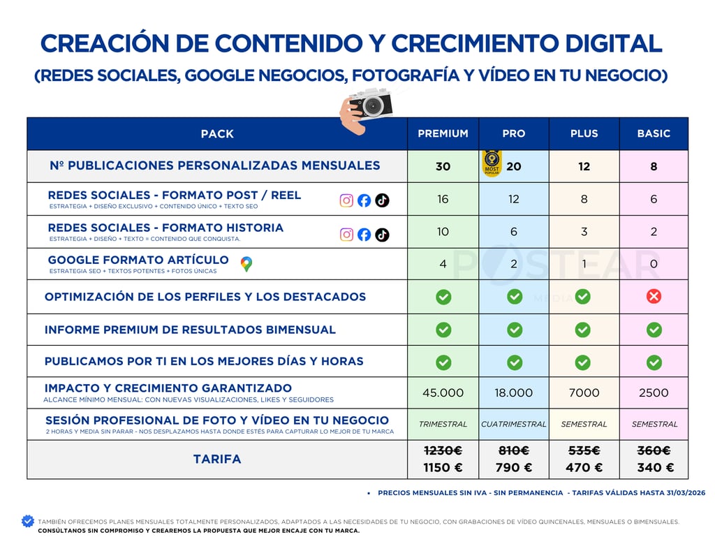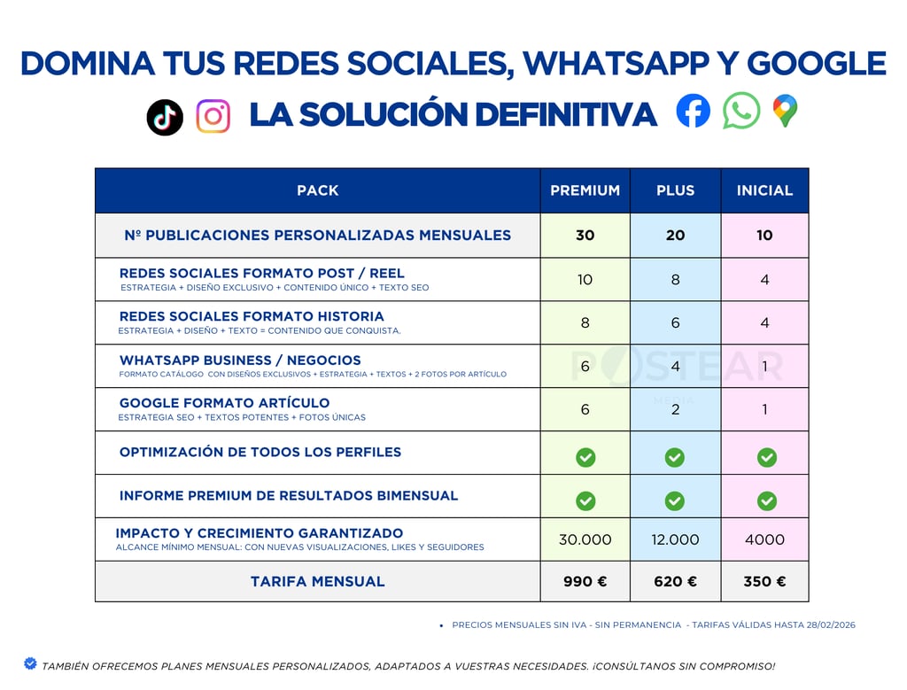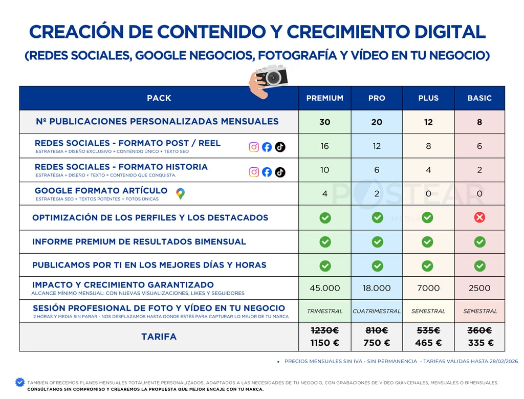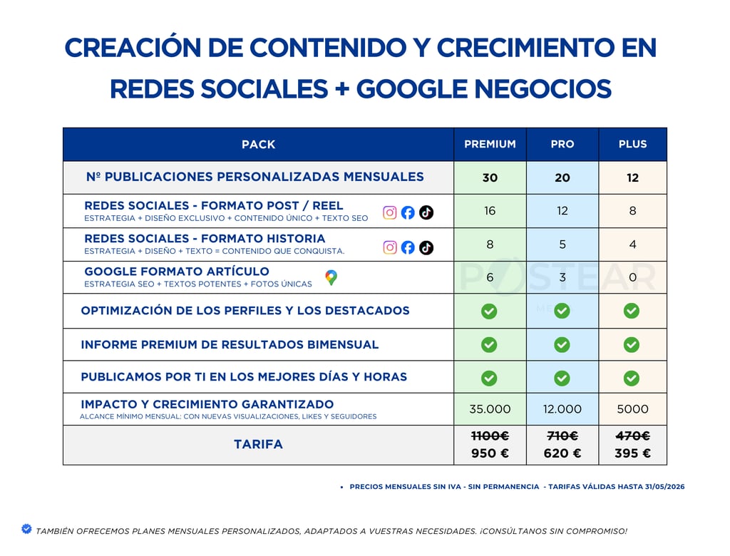 En Postear Media te ofrecemos lo mejor de ambos mundos: planes estructurados que te aportan tranquilidad y te ayudan a alcanzar objetivos concretos, y soluciones 100 % personalizadas, adaptadas a las necesidades reales de tu empresa.